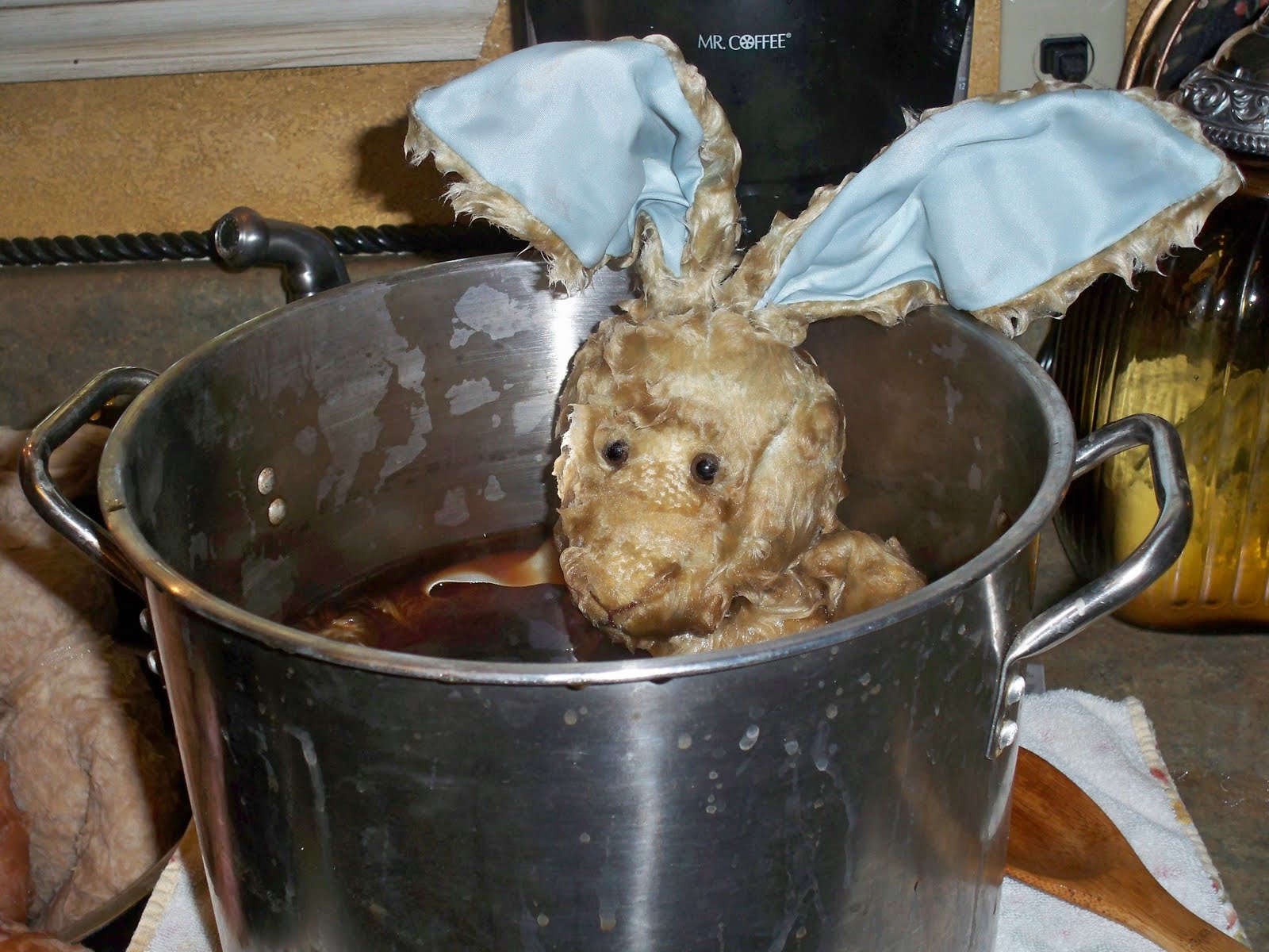 Today, I thought I would tea dye these sweet bunnies that I had saved to take to Canton being that Easter is on the way!! Now I have tea dyed MANY things........some being lace, fabrics, curtains, bedding, clothing and I could go on and on!!! I just love the way the tea gives that older, vintage look to almost anything! Now, I must admit that I have never dyed any type of stuffed animal, and when I got started with these sweet bunnies, it kinda bothered me.........it was like they were "Road Kill" being thrown in the stew pot or something!!! Now does this sound crazy???? Or maybe it could be all the fumes from the "E 6000" I have been using all week getting ready for Canton! I guess it is their little faces that did the trick! LOL I even stopped the process to grab the camera and take pics of the experience!!! O.K.....by now, you are either laughing your "cotton tail " off or thinking instead of "girl gone junkin", it's "girl gone wacky wabbit crazy"!!! Guess I will just let ya'll decide!